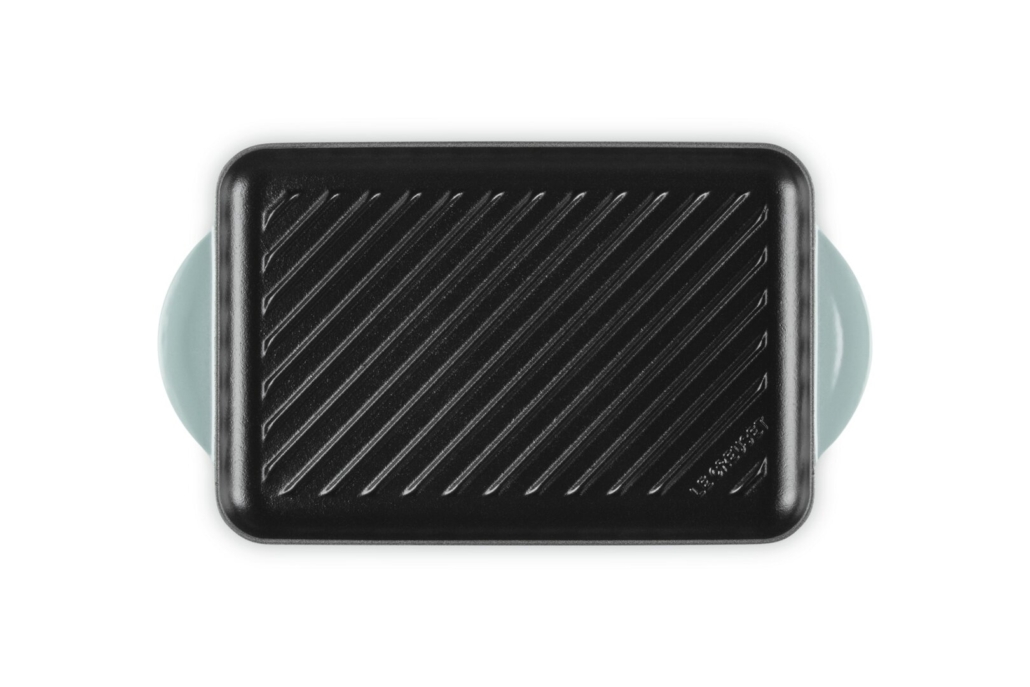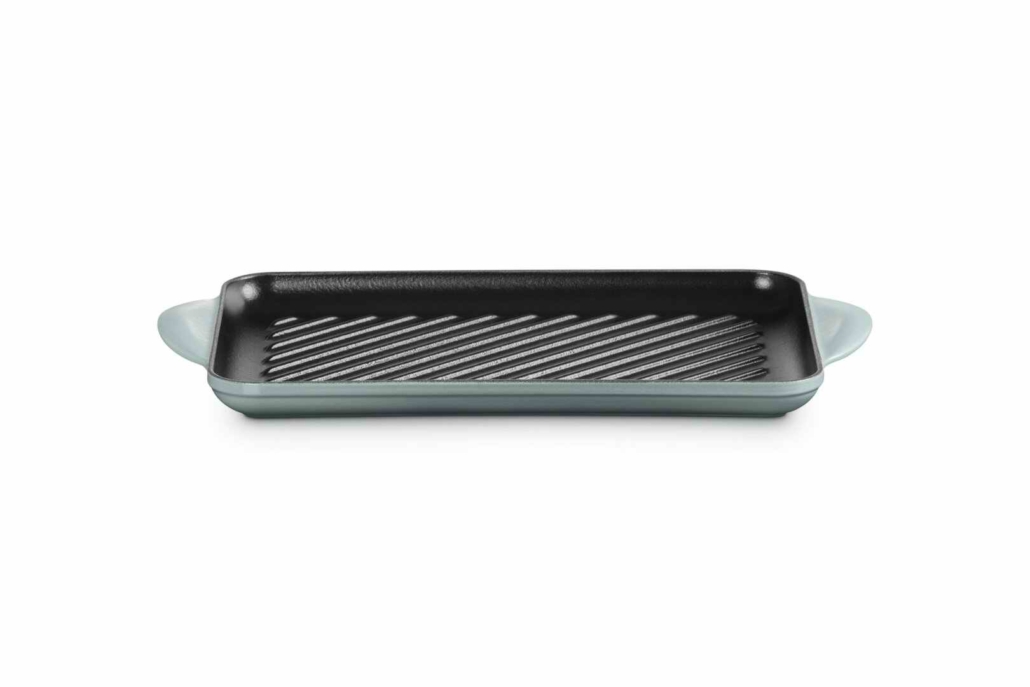 Grill rettangolare in ghisa Le Creuset 32,5×22 cm. Smalto nero, duraturo e resistente alle alte temperature. Colore esterno sea salt. Adatta anche all’induzione. La trovi in vendita online e in negozio a Torino
