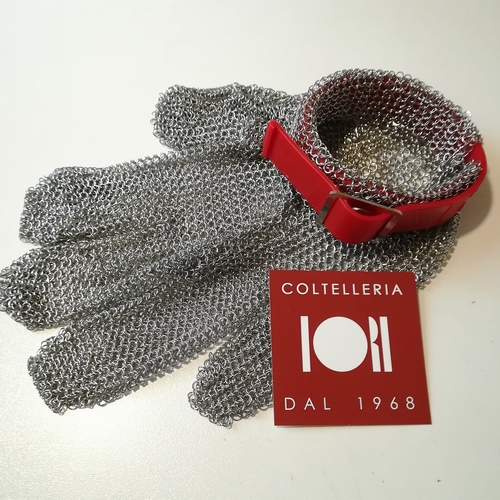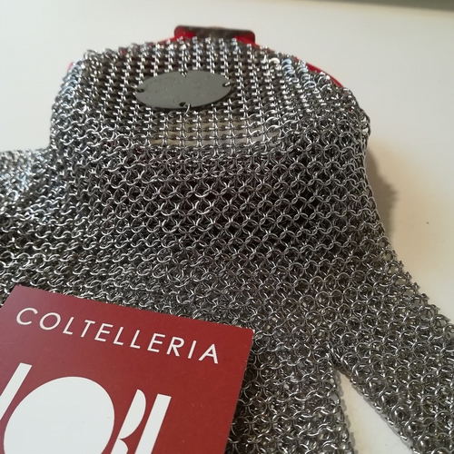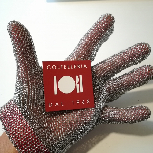 Guanto di sicurezza in acciaio inossidabile, ideale per proteggere la mano da ferite durante l’uso del coltello.