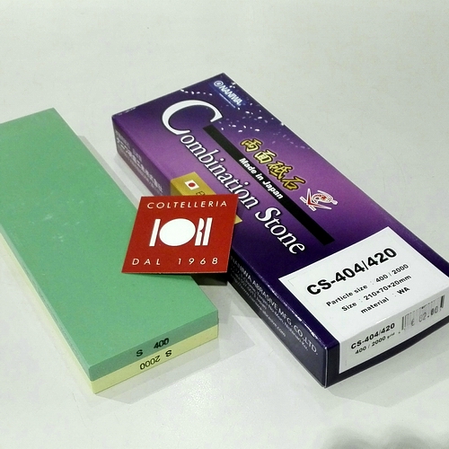Naniwa Combination Stone a doppia grana, 400/2000 grit. Pietra giapponese sintetica per l’affilatura dei coltelli. La linea Combination Stone abbina due pietre di diversa grana della linea Super Stone di Naniwa consentendo due tipi di lavorazione diversi. Come la Super Stone, la Combination Stone ha una gamma di grit (granulomentria dell’abrasivo) tra i 220 e i 12000. Noi abbiamo scelto i più significativi e utili pensando all’utilizzo su coltelli da cucina di alta gamma. Super Stone Naniwa, oltre ad avere una alta abrasività e velocità di utilizzo, ha una elevata durezza del legante, il che riduce il consumo della pietra e la formazione di concavità sul piano.