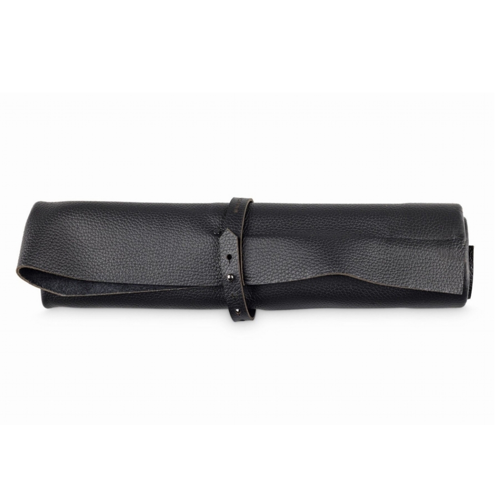 Rotolo porta coltelli in pelle bovina, di colore nero, Ideale per il trasporto di 6 coltelli. In vendita online oppure in negozio a Torino.