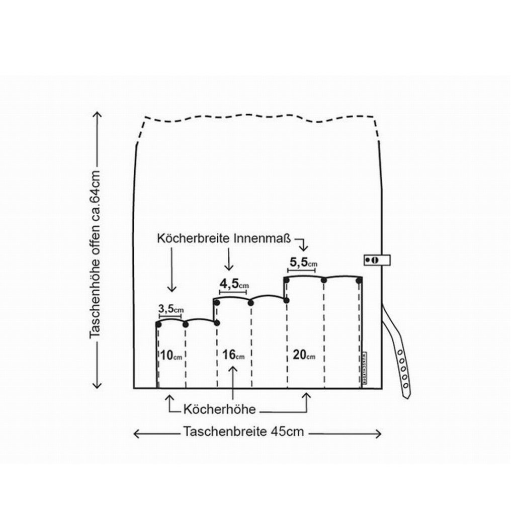 La borsa consente di riporre sino a 6 coltelli;  le 6 sezioni, in tre larghezze diverse, offrono uno spazio ottimale per lame di misure diverse.